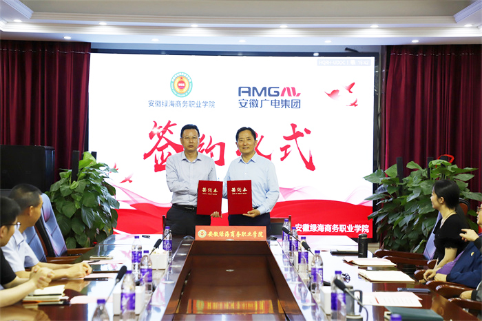 在“星青年职教频道”短视频运营服务协议签约仪式环节,绿海学院“星青年职教频道”副组长姜维长和安徽五星东方影视投资有限公司市场部经理蔡立分别代表双方进行签约。绿海学院与安徽广电集团签约,该频道将以代运营的方式与广电集团联合运营。“星青年职教频道”致力于拓宽学生的实践与创新空间,加强素质教育向数字化转型,传播绿海学院星青年文化以及办学育人成果。双方合作,可以将学校多年办学育人经验和广电集团策划运营经验有效结合,共同推动星青年职教频道“传播万家,誉满华夏”。