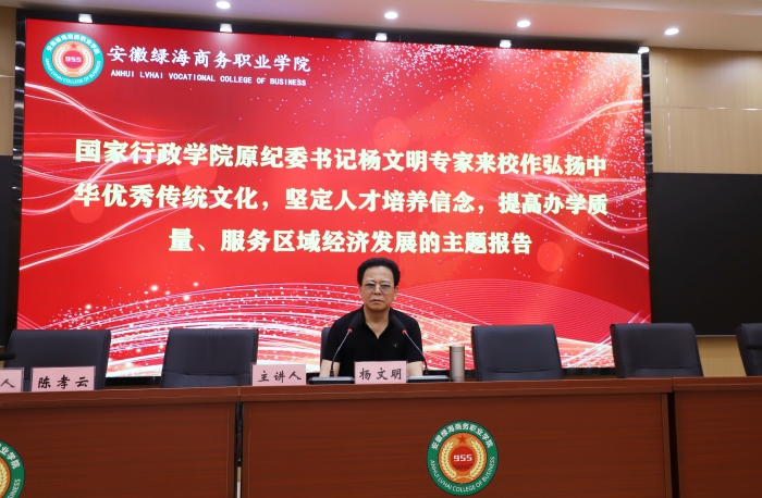 杨文明以《弘扬中华优秀传统文化、坚定人才培养信念、提高办学质量、服务区域经济发展》为主题,对职业教育如何传承中华优秀传统文化、提高办学质量、加强人才培养、做好社会服务,促进经济社会发展作了精辟阐述。他指出,职业教育大有可为,要深刻理解教育是国之大计、党之大计,准确把握教育、科技、人才是全面建设社会主义现代化国家的基础性、战略性支撑。绿海学院立足学校实际,以星青年人才培养为特色,为党育人、为国育才,把教育事业放在全面建设社会主义现代化国家、全面推进中华民族伟大复兴的大局中去思考,值得肯定。下一步学校要继续以中华优秀传统文化为支撑,坚定星青年人才培养理念,不断提升办学水平,办学能力,贡献职教力量,服务经济社会发展。