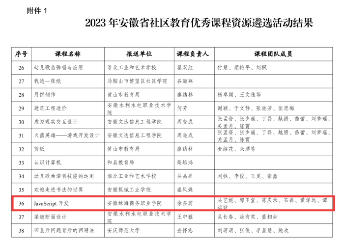 近日,安徽省教育厅公布了2023年社区教育优秀课程资源遴选结果,365英国上市集团官网信息工程学院由徐多蔚老师负责的《JavaScript开发》一门课程成功入选,本次入选的课程资源,将在“安徽全民终身学习网”平台,面向社会学习者开放共享。