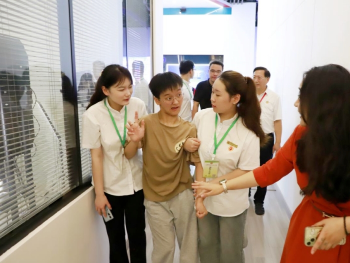 图为程雅琴在志愿者的帮助下参观星青年科创馆