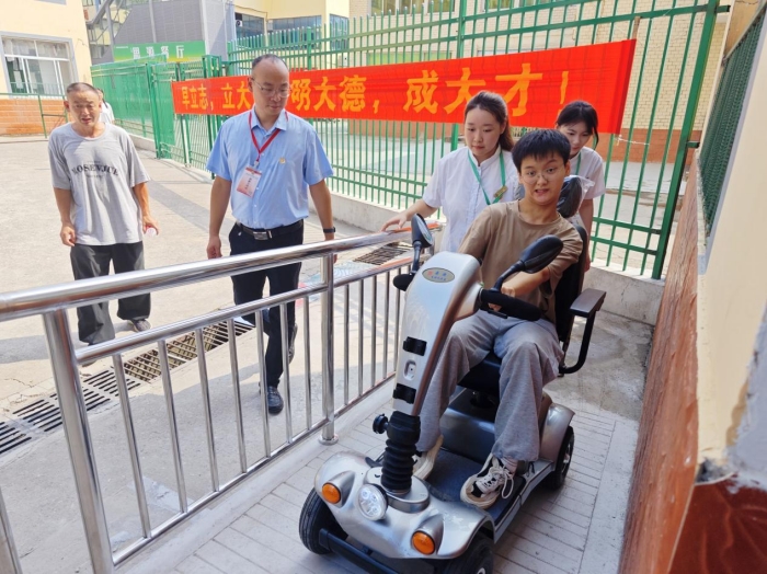 图为程雅琴通过无障碍改造后的爱心通道前往宿舍