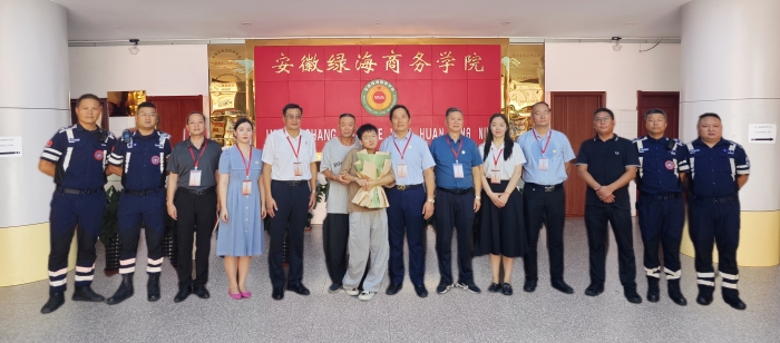 图为程雅琴父女和阜南公益救援队与安徽绿海商务学院领导老师合照