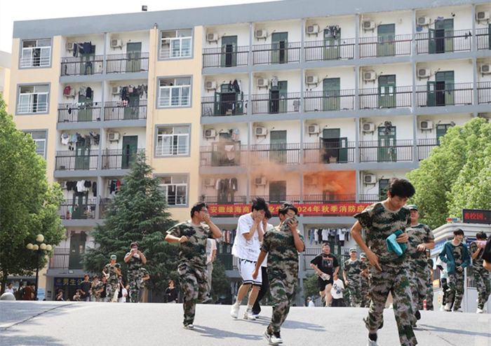 13:00,演练总指挥发出“演练开始”的指令,宿舍楼出现橙色模拟火情浓烟,警报声响起。保卫处立即组织人员赶赴楼层进行模拟灭火演练,医务救护组人员在一旁待命,随时准备急救。各楼学生在辅导员、宿舍管理人员、军训教官的引导下,沿安全通道快速有序撤离,到达指定疏散集结点。演练现场组织有序,所有人员均安全撤离。