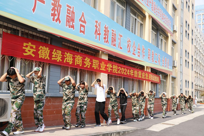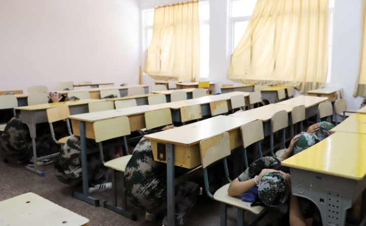 13:50,参加演练师生转场至教学楼教室,随着模拟“地震”警报信号发出,教学楼各班老师立即停止授课,组织学生按照地震应急避险要求,迅速蹲下,蜷曲身体,降低身体重心,双手护头,就近躲在课桌下进行避震。 随着疏散指令发出,参演师生双手护头按照预定疏散路线,快速、有序的撤离教学楼向指定集合点疏散。同时,辅导员、保卫人员、军训教官在楼道、楼梯口等处加以指引、疏导,防止出现拥挤、踩踏。师生全部安全撤离到达指定疏散集合点。