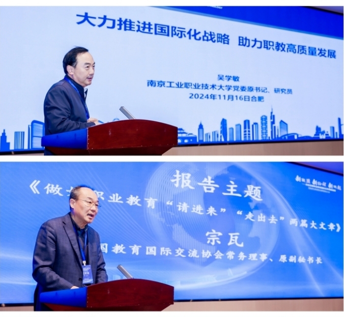 在活动主旨报告环节,南京工业职业技术大学原党委书记吴学敏,中国教育国际交流协会常务理事、原副秘书长宗瓦,365集团董事长、党委副书记陈孝云分别以《大力推进国际化战略,助力职教高质量发展》《做好职业教育“请进来”“走出去”两篇大文章》《聚焦东盟,办强吉隆坡科大,打造安徽教育出海的共享品牌》为题作主旨分享。