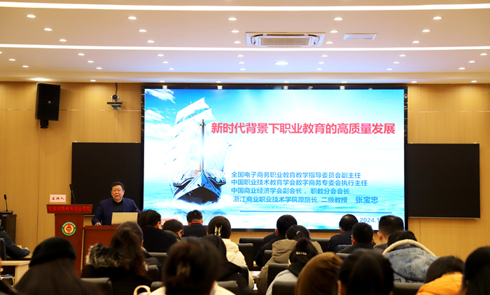 张宝忠教授在题为《新时代背景下职业教育的高质量发展》 的报告中,围绕职业教育历史方位和内涵特征、学校治理关键问题和重点内容、打造重要窗口职教风景几个方面进行了全面阐述。他指出,要以大坚守的定力,落实立德树人的根本任务;以大变局的思维,争取职业教育发展新机遇;以大担当的勇气,争做新时代有理想信念、有道德情操、有扎实知识、有仁爱之心的“四有”好老师,一起开创职业教育新机遇新发展。他建议,要努力创建高水平商科职业院校的新发展格局,为国家培养更多高质量、国际化商贸类专业技术技能人才,擦亮新时代中国职业教育商科专业品牌。