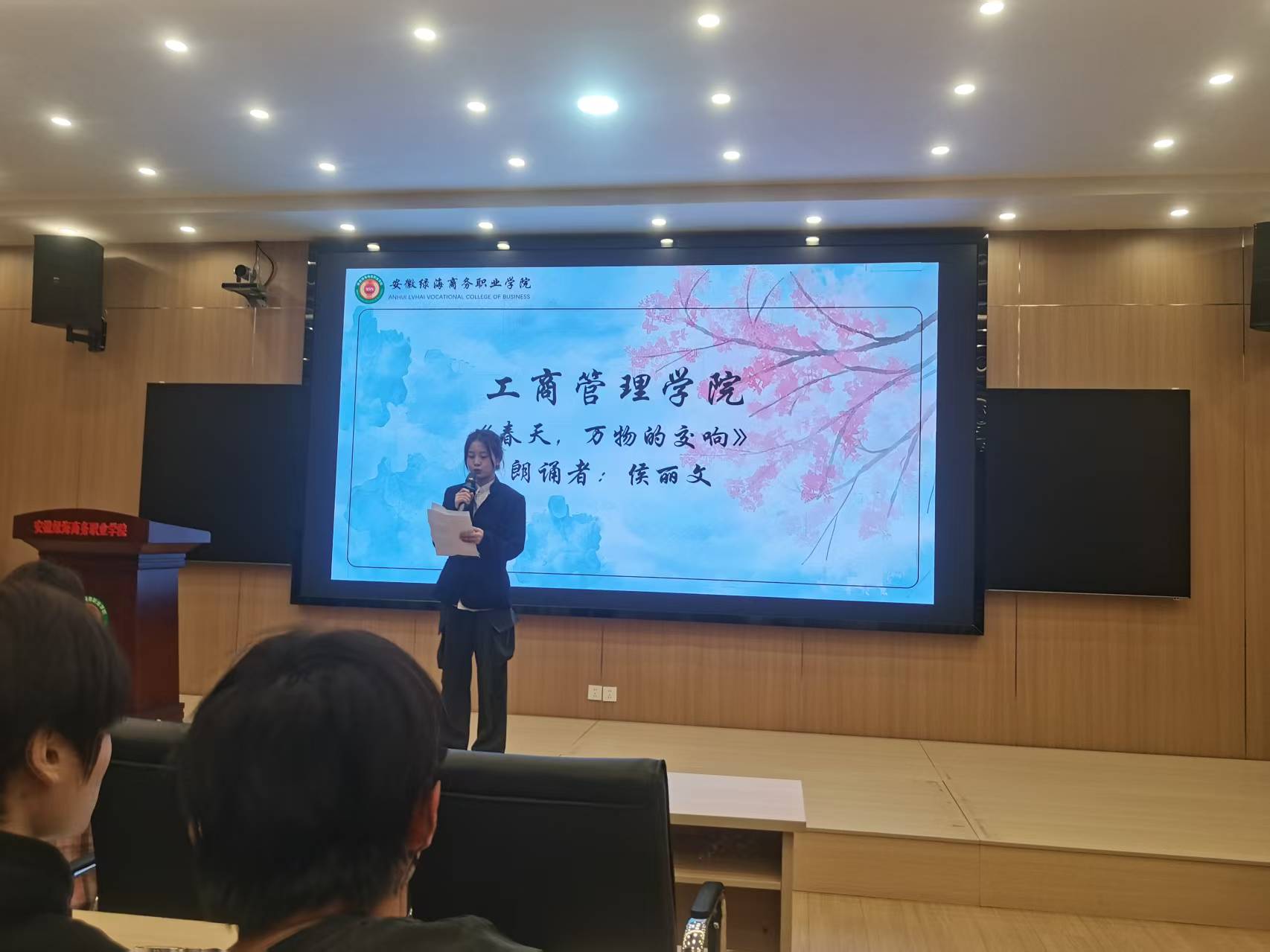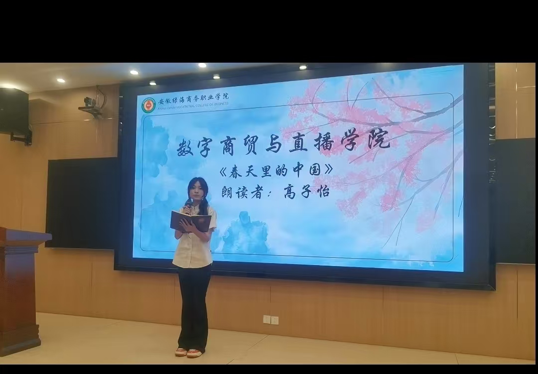 彩排现场,各学院学生依次登台展示精心准备的朗诵作品。在背景音乐与视频的烘托下,诗歌的意境与朗诵者的表达交相辉映。尤其值得关注的是,数字商贸与直播学院高子怡同学的精彩表现赢得了在场师生的热烈掌声。该同学不仅声音洪亮、节奏把控精准,更以自然生动的表情和充沛的情感,将诗歌的磅礴气势展现得淋漓尽致。指导教师点评时称赞其“进步神速,自信从容的台风令人眼前一亮”。
