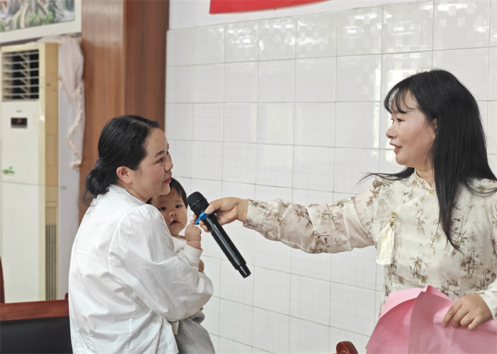 现场特别设置的“飞花令”环节,成为校社智慧交融的焦点。现场师生与市民踊跃参与,一句句含“春”诗句如珠玉迸发。一位怀抱一岁宝宝的市民主动登台,不仅流利接续诗句,还即兴背诵杜甫的《绝句》,展现全民阅读的生动图景。