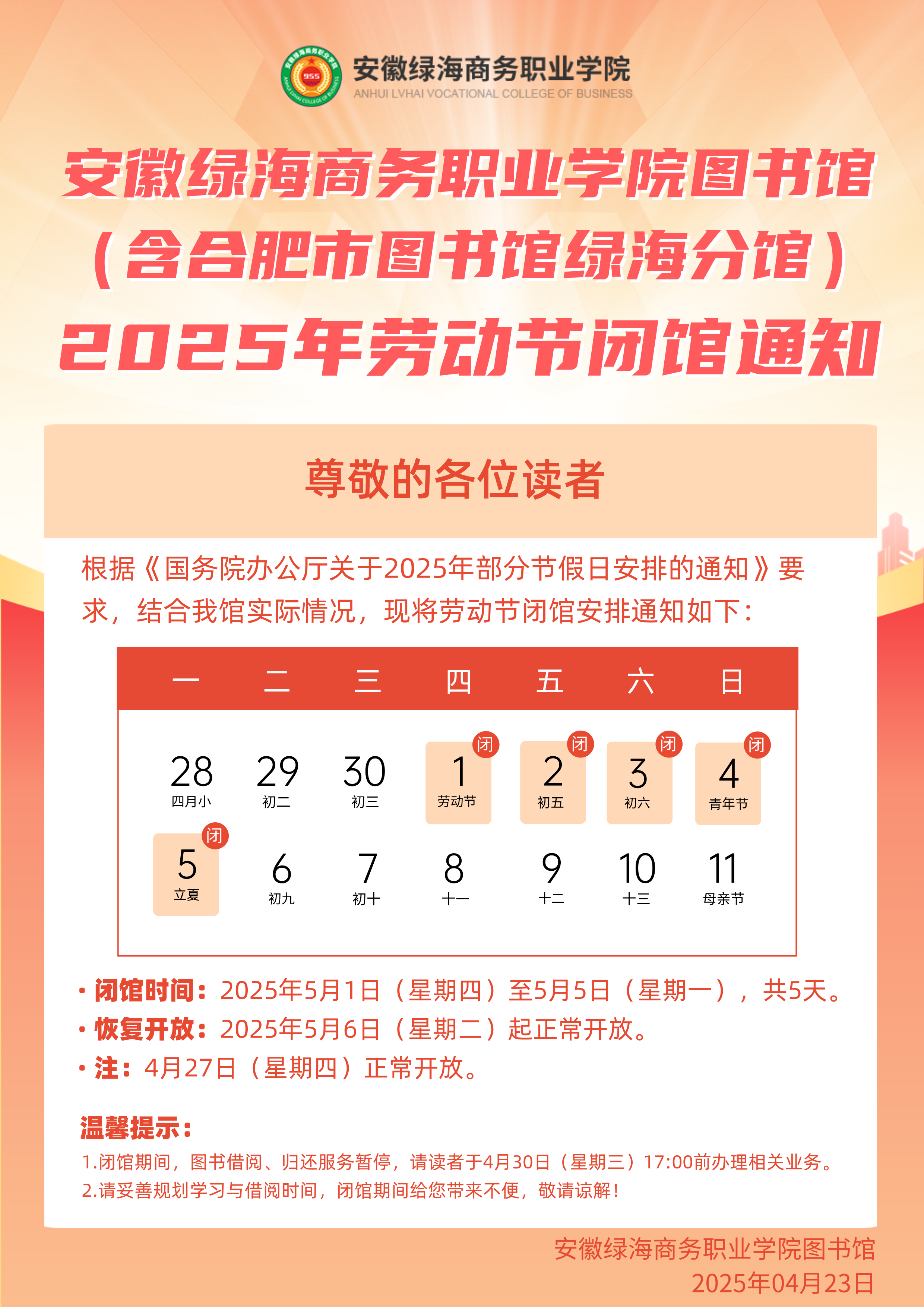 365集团图书馆(含合肥市图书馆绿海分馆) 2025年劳动节闭馆通知