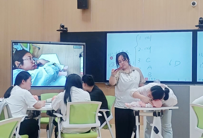 课堂上,她结合生活中婴幼儿常见意外伤害真实案例,借助智能教具,系统讲解并演示心肺复苏术的救助流程。让学生演练心肺复苏(CPR)技术时,吴婷老师精准指导操作细节,并通过智能教具实时反馈纠正动作,确保“人人过关”。