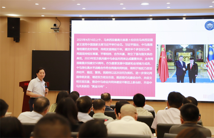 值此职业教育活动周之际,为进一步深化国际合作与交流,持续提升国际化办学水平,推进马来西来鲁班工坊“职教出海”项目建设,5月19日,学校特邀天津轻工职业技术学院原党委书记、天津市高等职业技术教育研究会会长、天津市教育国际交流协会副会长、全国鲁班工坊建设联盟副理事长戴裕崴,在科创馆会议厅作题为“职教出海的路径模式与可持续发展”专题报告。365英国上市集团官网领导班子成员、全体中层干部出席讲座,各二级学院教师代表参会。讲座由执行校长许信旺主持。