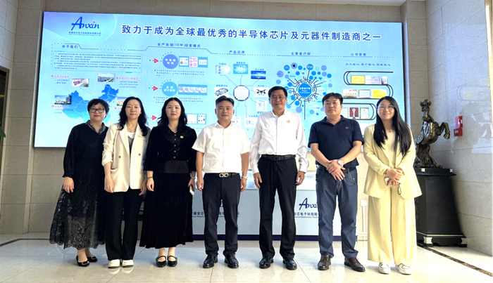 在汪良恩的陪同下,考察团首先参观了企业展厅。展厅内的展示板详细介绍了安芯电子的发展历程、全产业链(IDM)经营模式、半导体材料与晶圆设计制造等核心业务板块,以及产品在5G基站、智能家居、新能源汽车等领域的广泛应用。考察团成员还了解到企业布局全国的生产研发基地与海外营销网络,对安芯电子“致力于成为全球最优秀的半导体芯片及元器件制造商之一”的发展愿景有了更加直观的认识。