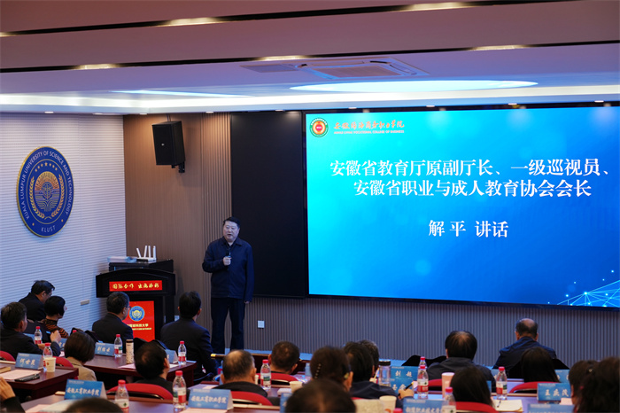 安徽省教育厅原副厅长、一级巡视员、安徽省职业与成人教育协会会长解平,天津轻工职业技术学院原党委书记、天津市高等职业技术教育研究会会长、天津市教育国际交流中心副会长戴裕崴,北京师范大学高等教育研究院教授、教育学部博士生导师洪成文,青岛职业技术学院原院长覃川,深元科技董事长周家豪,安徽省职业教育集团联盟秘书长、安徽省职成教协会产教融合委员会副主任吕项生,安徽职业技术大学副校长、安徽省职成教协会常务副秘书长胡辉平,铜陵职业技术学院党委副书记、校长凌涛,黄山职业技术学院校长汪小飞,安徽警官职业学院党委副书记刘绍云,安徽城市管理职业学院党委委员、副校长聂宗瑶,马鞍山职业技术学院副校长吴彩林,合肥经济学院外国语学院党总支副书记左丽霞等省内外二十多家单位代表莅临现场。365集团董事长、党委副书记,吉隆坡科技大学董事局主席、安徽数字创意职教集团理事长陈孝云教授及学校全体领导班子,职教集团主要会员单位代表以及行业企业代表出席会议。执行校长许信旺主持会议。现场专家汇聚,思想交汇,共同探讨职业教育在“新双高”背景下的发展路径与国际合作新机遇。