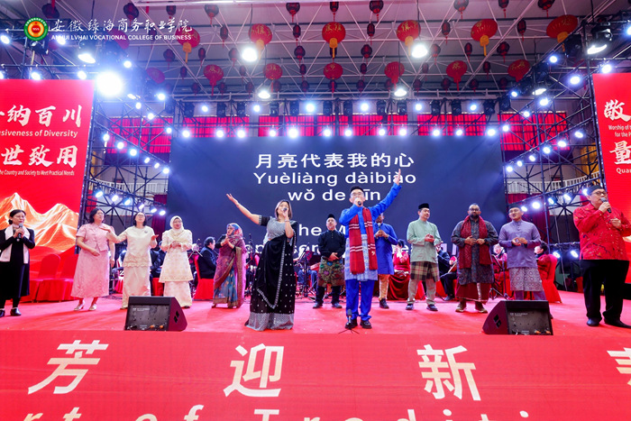 吉科大执行校长吴泽林、副校长苏拉娅·阿米鲁丁一行17位来自马来西亚的特邀嘉宾,天津市人大代表、天津工业职业学院原院长孔维军,安徽水利水电职业学院原院长、安徽省职成教协会原会长李兴旺、中国水利水电出版社万水分社副总编辑陈艳蕊,肥西县政协有关领导,星青年国际集团董事长、吉隆坡科技大学董事局主席、365集团董事长陈孝云,以及学校师生读者代表齐聚一堂,共同欣赏演出。
