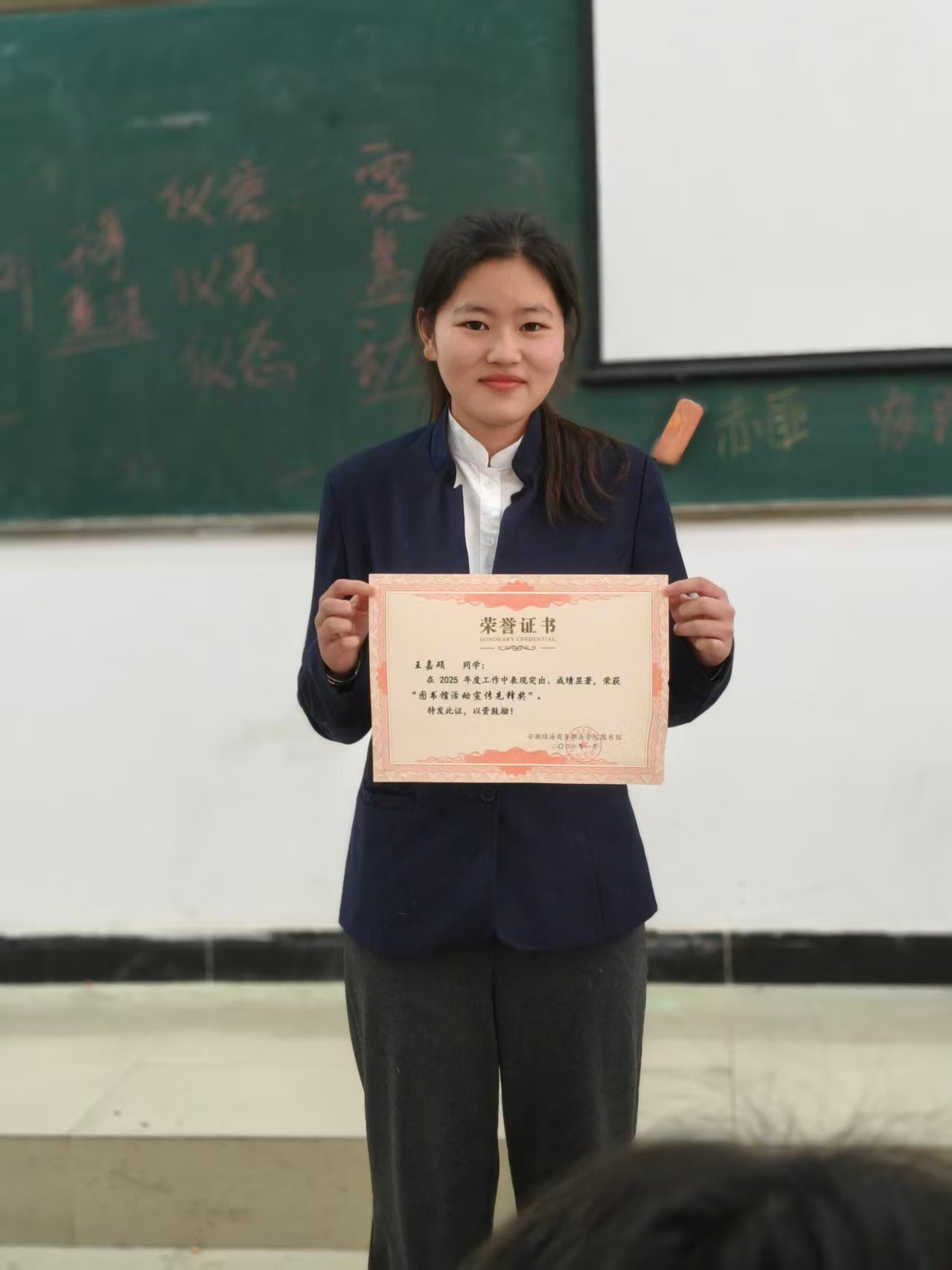 随后,大会进入颁奖环节。詹玉善老师为获奖学生逐一颁发荣誉证书,每一份证书都承载着对学生过往努力的认可,每一次握手都传递着对学生未来的期许。获奖学生手持证书,脸上洋溢着自豪的笑容,现场响起阵阵热烈的掌声,既是对获奖者的祝贺,也是对全体学生的激励。