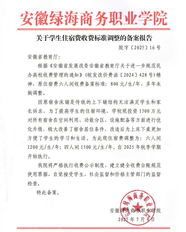 关于学生住宿费收费标准调整的备案报告