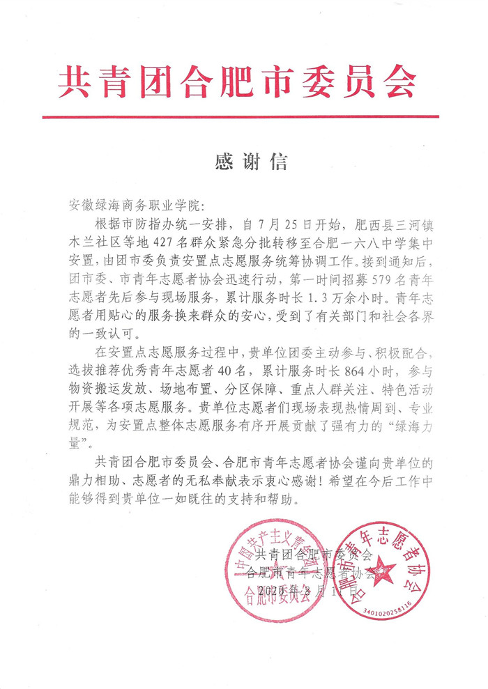 “星青年”再出发 “志愿红”暖人心 合肥团市委为365集团送来防汛安置志愿服务感谢信