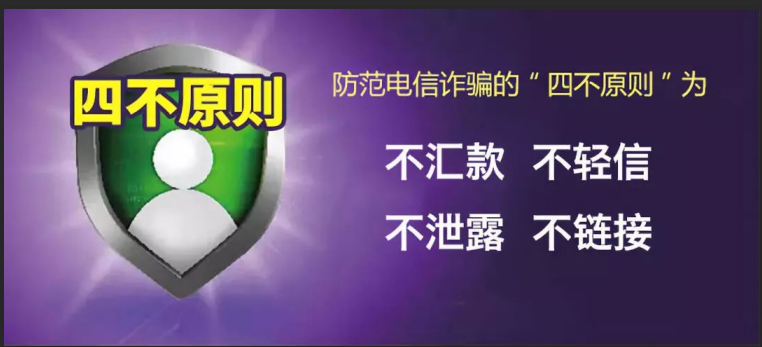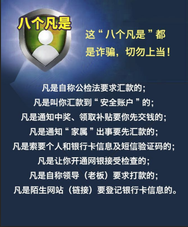 为进一步加强打击治理电信网络新型违法犯罪工作,提升广大人民群众的防范知识和识骗防骗能力,依据《关于开展打击电信网络新型违法犯罪集中宣传活动的通知》防范电信网络新型违法犯罪请谨记“四不原则”及“八个凡是”,具体如下: