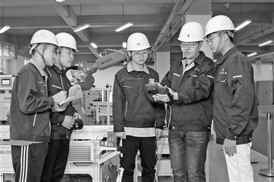 图为辽宁机电职业技术学院工业机器人技术专业教师夏金伟指导学生进行工业机器人现场编程。