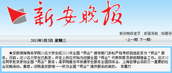 新安晚报教育短讯——绿海学院10名学生进京服务“两会”