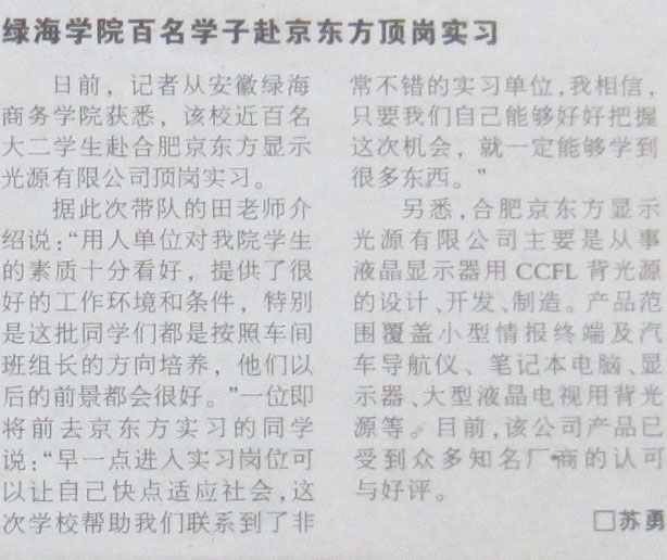 安徽商报——绿海学院百名学子赴京东方顶岗实习