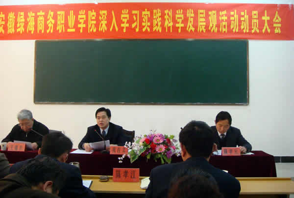 3月26日下午,我院在教学楼阶四教室召开深入学习实践科学发展观活动动员大会,对我院开展深入学习实践科学发展观活动进行全面动员和部署。党组织负责人、督导专员、院学习实践科学发展观活动领导小组组长祝吉太书记作动员报告。院学习实践科学发展观活动领导小组副组长陈孝云董事长传达合肥市教育局深入学习实践科学发展观活动动员大会精神。院董事会领导及全体董事、院党政领导、全体员、科级以上干部、人大代表、政协委员、民主党派成员、入党积极分子代表、教师代表和学生代表共180余人参加动员大会。会议由院学习实践活动领导小组副组长王端庆院长主持。