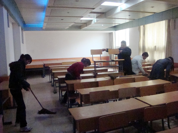 在团委负责人的统一指挥下,大家各自分工,对学院的6个多媒体教室和8个阶梯教室进行了彻底的清扫。劳动现场,同学们争先恐后、拿起抹布,挥起扫把,认真的打扫每一个角落。经过一个小时左右的时间,顺利完成了任务。此外,院团委还在各个多媒体和阶梯教室以及开水房等处挂起了“打水有风度,水温不留情”等“温馨提示”,极大的方便了同学们的生活,给他们送去了春天里的暖意。