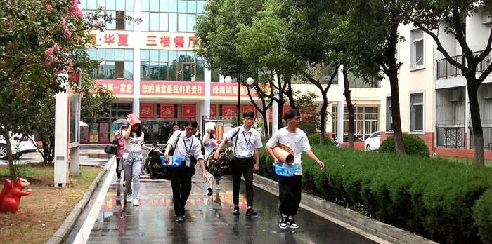 迎新第一天,他们冒着大雨帮新生撑伞、搬行李,丝毫不顾雨水湿透了鞋子和裤管,第二天雨后闷热来袭,他们顶着秋后的烈日,汗如雨下却依然以饱满的热情投入到迎新工作中。