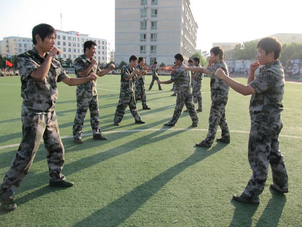 伴随着激昂的军乐曲,分列式的表演正式开始。受阅方队迈着整齐的步伐,挥动着坚毅的臂膀,雄赳赳地经过主席台,汇报15天的军训成果,接受领导的检阅。他们个个意气风发、斗志昂扬,他们坚定从容的表情、嘹亮高亢的口号,铿锵有力的步伐尽显2010届新生顽强的意志和奋发的精神。紧接着,汇报表演中,教官一声令下,女生方队迅速组成心型,手腕系红丝带,伴随着歌曲《感恩的心》,她们以手语的方式表达“知感恩、学感恩、传感恩”的坚定信念。男生方队的擒敌拳表演,目光坚毅,动作刚劲有力,无不显示男儿的傲骨之风。场上还有集体舞、组字表演等精彩汇演活动。