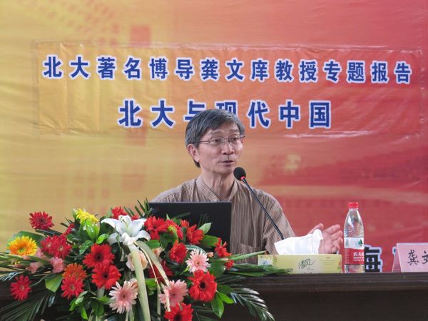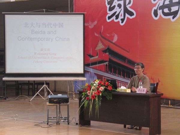 龚教授在首场报告中介绍了北大诞生的历史背景。在风雨飘摇的清王朝末期,社会形态亟需更迭的历史时期,戊戌变法成就了一个承载新思想、孕育济世人才的学府——京师大学堂(北京大学前身)。在阐述北大在近现代史中的地位时,龚教授认为北大是“新与旧相遇的地方”、“中与西相遇的地方”。作为新文化运动的中心和五四运动的发源地,北大为民族的振兴和解放、的建设和发展、社会的文明和进步做出了突出的贡献。龚教授在诠释北大精神时强调,百年以来,北大以宽阔的胸襟和气魄、自由的学术思想和兼容并包的精神,勤奋、严谨、求实、创新的学风,对的现代教育产生着深远的影响。龚教授希望绿海学子牢记历史,学习北大精神,发扬爱国、民主的优良传统,以振兴中华为己任,刻苦学习、务实求真,做有理想、有道德的人,为建设繁荣富强的社会主义祖国做出积极的贡献。