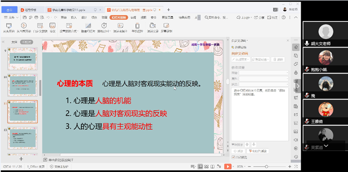 从近几日的线上教学巡查情况来看,授课教师课前准备充分、授课认真、讲解具体,能够较为熟练地操作授课平台,并能充分利用平台功能进行互动,增加趣味性,有效地活跃了课堂气氛。同时,大部分老师利用微信、QQ建立班级课程学习群,积极在群上开展讨论、答疑。整个教学活动开展规范、有序、有条不紊。广大教师的高度重视、积极钻研和辛勤付出,很好地带动了学生的学习积极性。从巡课反馈看,学生到课率高,能踊跃地参与互动,一定程度上可反映出学生对线上教学方式的认可度比较高。