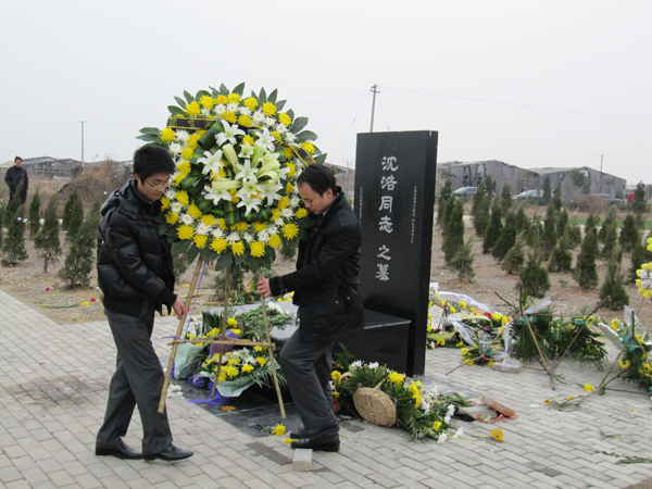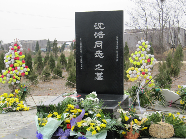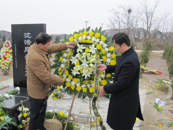 在沈浩墓地前,我院举行了庄重的凭吊仪式。师生代表首先向沈浩同志敬献鲜花扎成的花篮,摆放在他的墓前。陈董事长和石院长上前轻轻整理花篮缎带。缎带上写着“深切缅怀沈浩同志”。全体人员肃立,向沈浩同志三鞠躬。