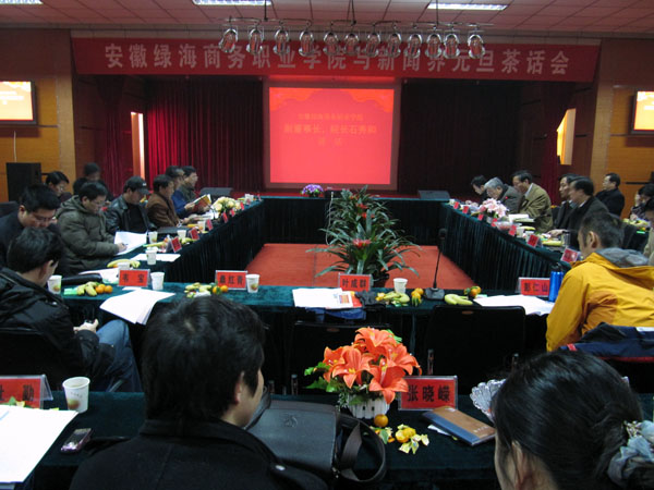 12月25日上午,我院召开新闻界元旦茶话会,来自安徽日报、安徽电视台、新安晚报、合肥晚报、安徽商报、安徽法制报、安徽市场报、合肥日报、合肥电视台、中安在线等省市主流媒体的近30位领导、记者济济一堂,就如何促进学院教育教学、提升学院品牌形象,共同谋划学院发展进行了热烈的交流。