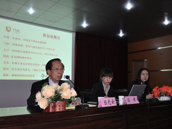 在与我院学生的交流会上,陈光云博士简单介绍了新加坡国情地貌及教育概况,随行的TMC学院的高琴老师详细讲解了该学院的教学计划、课程设置、学生管理等。其后,现场同学踊跃提问,陈光云博士和高琴老师均热情给予回答,并给大家分析了新加坡的教育市场、国际形势以及就业情况等。