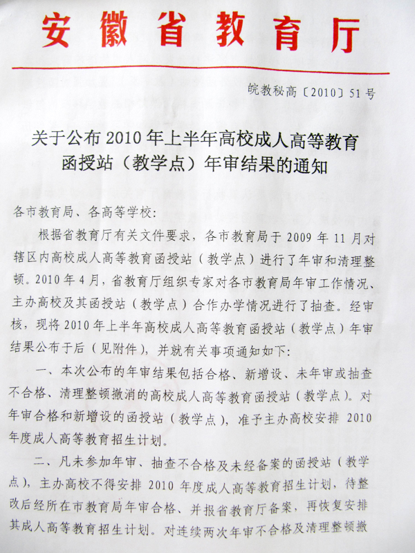 日前,省教育厅下发皖教秘高【2010】51号文件(关于公布2010年上半年高校成人高等教育函授站(教学点)年审结果的通知),批准我院正式成为安徽工程大学成人高等教育合肥函授站。