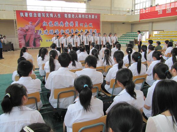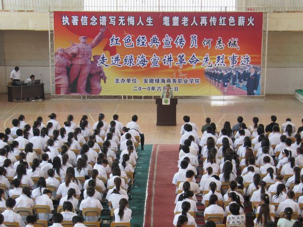 继5月8日红色经典宣传员何志城老人来我院做革命先烈事迹报告后,在我院师生中产生强烈反响。6月7日,我院再度邀请何老登上绿海讲坛,在全院范围内作更为广泛、深入的报告。报告会在体育馆二楼举行,我院董事会、党政领导及1000余名师生怀着满腔的热忱聆听了何老的报告。
