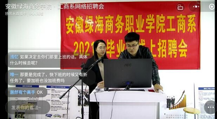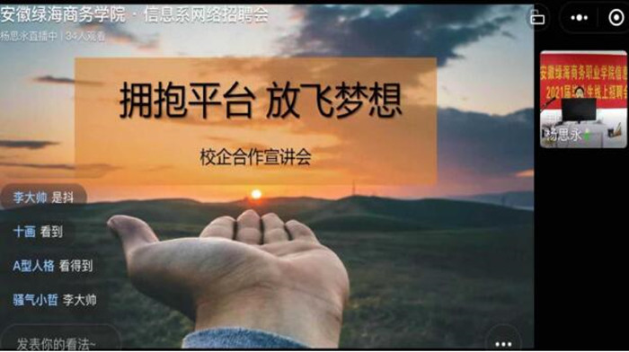 为进一步为拓宽毕业生就业渠道,搭建企业与学生之间零距离双选平台。11月7日,学院与安徽省华能新业人力资源有限公司通过企业微信平台进行网络直播招聘宣讲会。首批参会的海康威视、富芯微电子、平安、京东物流、老乡鸡等21家企业提供了计算机、物流、会计、客服等相关岗位近350个。