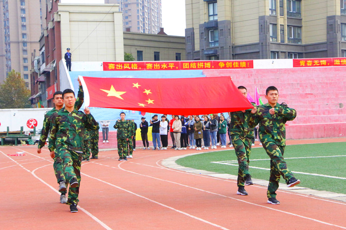 伴随着激昂奋进的《运动员进行曲》,国旗护卫队、校牌队、彩旗队依次通过主席台接受检阅。他们步伐矫健整齐,动作铿锵有力,向师生们展示了绿海学子英姿飒爽的风采。