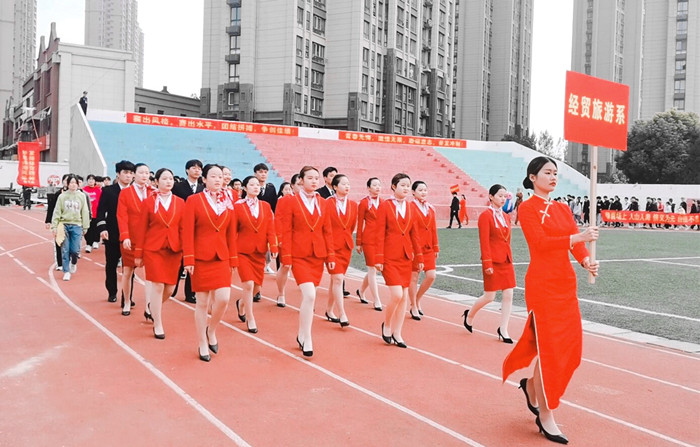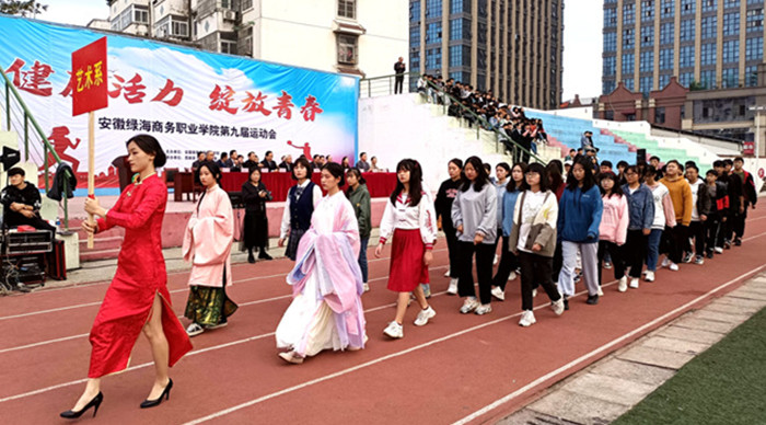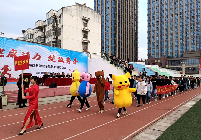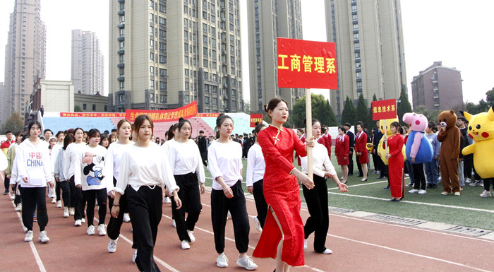 随后,各系运动员方阵陆续登场,他们踏着铿锵的节奏,迈着坚定的步伐,气宇轩昂、意气风发,嘹亮的口号喊出了师生们高昂的斗志。各方阵在入场秀上脑洞大开,形式多样、个性张扬。有古风雅韵汉服秀、有职业风采礼仪秀、有活泼可爱玩偶秀,还有现代科技无人机的助阵……创意入场充分展示了各系的特色及教学成果,成为塑胶运动场上一道道亮丽的风景。