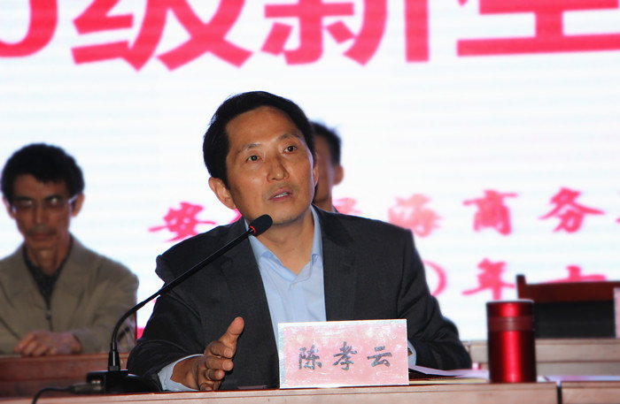 学院董事长、党委书记、星青年总培训师陈孝云发表讲话。他祝贺全体新生选择了绿海学院,把这里作为扬帆启航、展翅高飞和创造业绩的崭新起点。