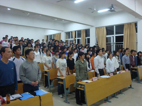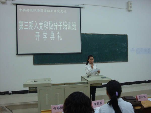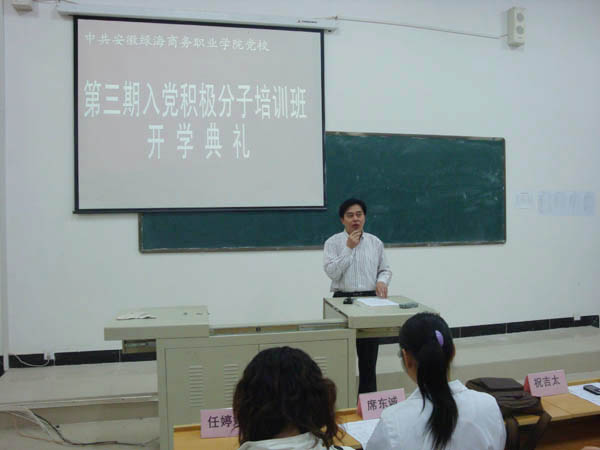 本网讯(党群办)2009年10月29日晚,我院党校第三期入党积极分子培训班开学典礼在教学楼阶八教室隆重举行。典礼由学院党群办秘书、党校办公室主任储汉民同志主持,省政府派驻我院督导专员、院党总支书记、党校校长祝吉太同志作动员报告,院党群办秘书、培训班班主任张传东同志宣布本期培训班组织机构、学习培训计划和学习纪律。经贸系党支部书记席东诚同志、信息技术系党支部书记任婷婷同志、基础部与管理系党支部书记俞文娟同志出席了开学典礼。