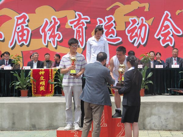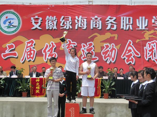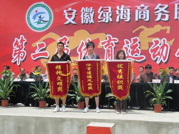 最后,院领导为获得本届运动会团体总分第一的信息系、第二名管理系、第三名经贸系颁发了奖杯;为荣获“道德风尚奖”的管理系、“优秀组织奖”外语系、“精神文明奖”继续教育部颁发锦旗,以资鼓励。