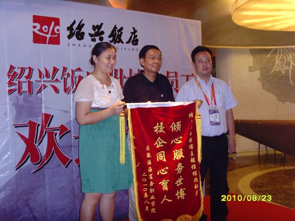 因学习需要,我院管理系42名实习生将提前返校,当晚,绍兴饭店为他们举办了欢送晚会,绍兴饭店领导、世博主题馆领导及我院丁元生一行应邀出席了欢送会。世博主题馆和绍兴饭店为同学们颁发了荣誉证书和纪念章,我院向绍兴饭店世博店赠送了“倾心服务世博 校企同心育人”的锦旗。