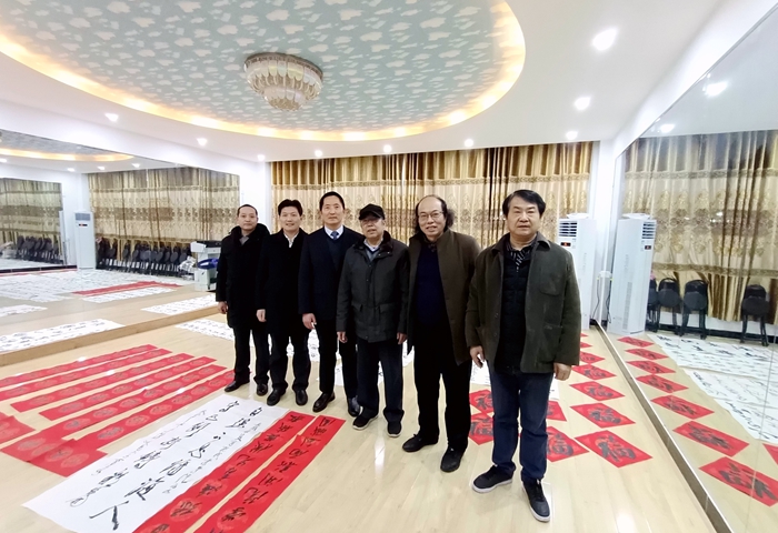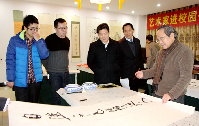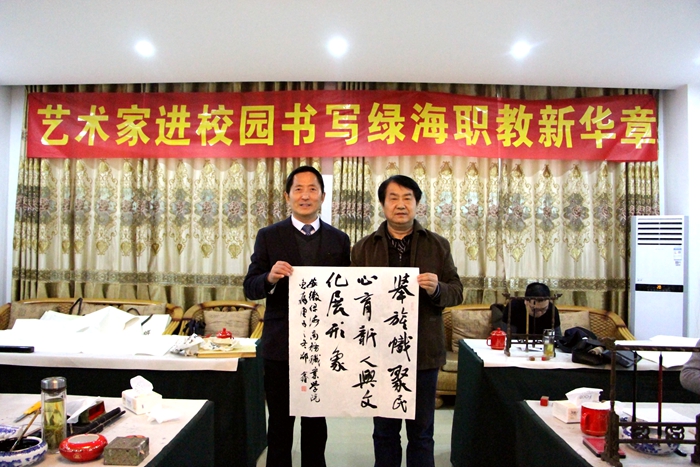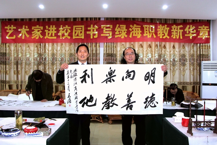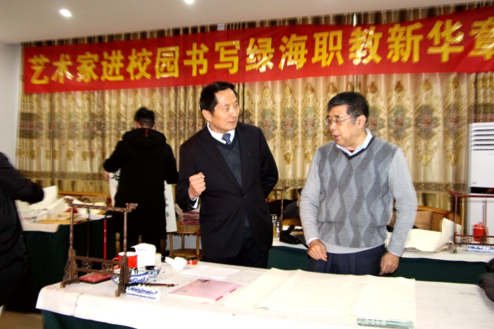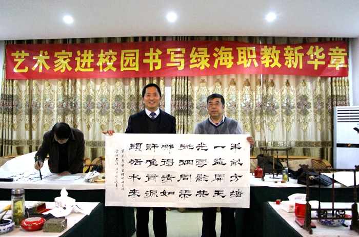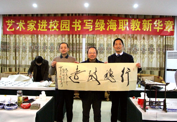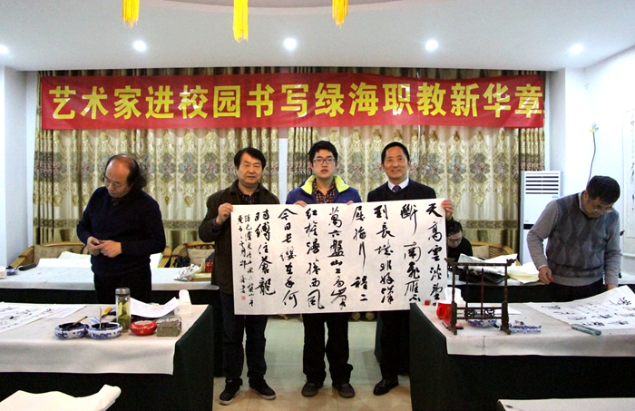 1月24日,安徽省著名书法家陈建国、王涛、邵鑫、袁文长一行莅临绿海学院,参加艺术家进校园“书写绿海新华章”笔会。