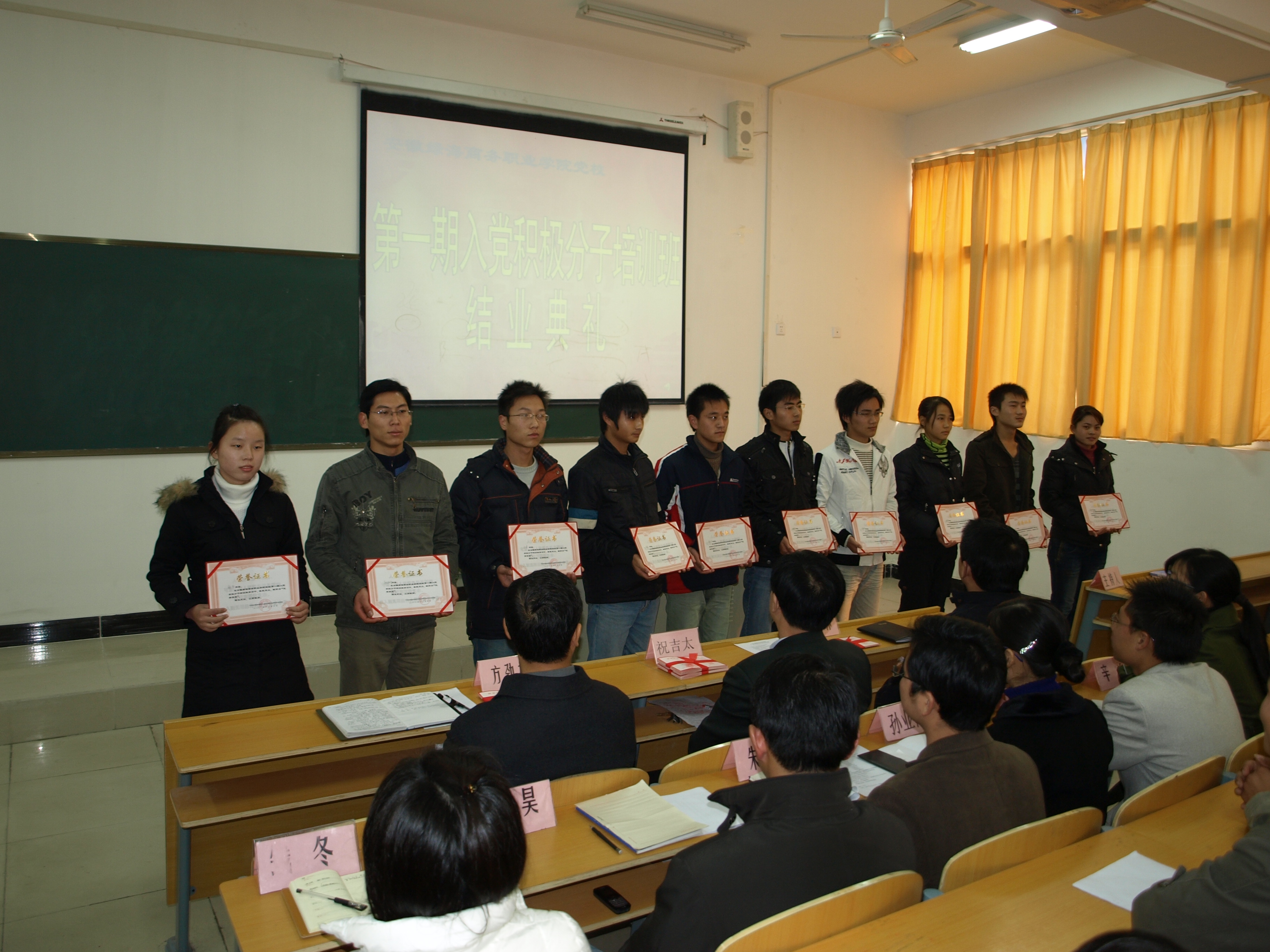 本网讯(党群办)2008年12月19日下午,我院党校第一期入党积极分子培训班结业典礼在第二教学楼第五阶梯教室隆重举行。省政府派驻我院督导专员、院党支部书记、党校校长祝吉太同志,院长助理、学生处处长方劲松同志,学生处副处长、团委负责人唐义林同志,院党支部委员、董办秘书钱冬同志,院党支部委员、教务处科长吴昊同志,团委副书记孙业萍同志、朱小明同志,管理系团总支书记辛敏同志、经贸系团总支副书记兰立刚同志出席了结业典礼。典礼由院党群办秘书、党校办公室主任储汉民同志主持。