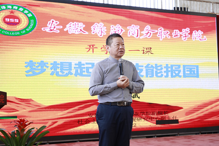 典礼结束后,学院副院长沈德斌作“开学第一课”——“梦想起航,技能报国”, 从立志、寻本、自省、恒心四个方面教育在座的新同学学习中华优秀传统文化,从其中汲取力量,以更加坚强的意志投入工作和学习。
