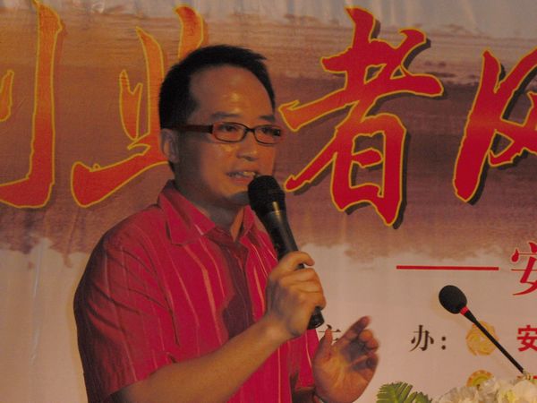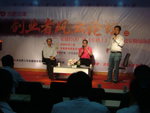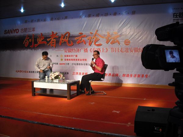 5月25日下午,我院与安徽经济广播电台圆满主办了“创业者风云论坛(二)”,知名主持人北海老师率《在路上》栏目组在我院学术报告厅录制该节目。特邀嘉宾安徽白马商业经营管理有限公司董事长汪登厚,合肥团购网、TOGO论坛创办人、CEO杨书军走进节目现场与广大绿海学子共同分享了他们的创业历程。学院陈孝云董事长、宋凡副院长、院办张以亭主任应邀出席了此次活动。