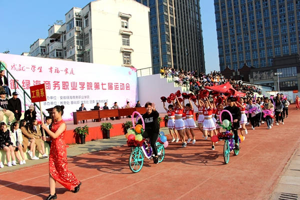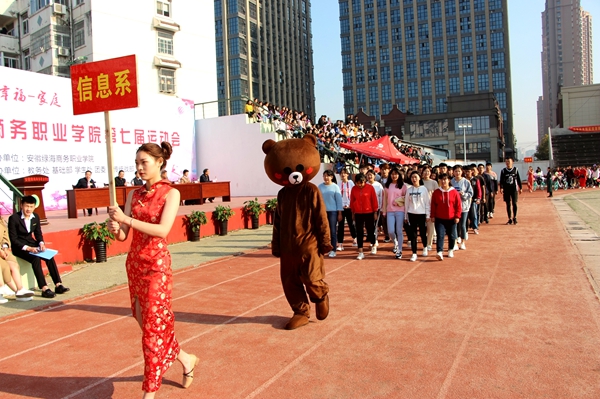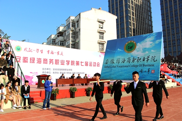 伴着雄壮激昂的运动员进行曲,国旗队、校牌队、彩旗队、裁判队、各系及教职工代表队依次入场。11个方队队形整齐划一、口号振奋人心。入场展示中各个方阵精心准备,各具特色,士气昂扬,充分展现了绿海人健康向上、积极进取的精神风貌。