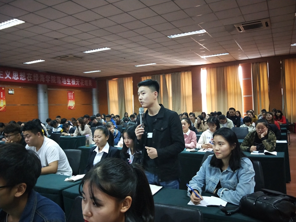 在全体同学起立鼓掌的热烈场景下,亲切的陈老师闪亮登台,以“从绿海起航 创造人生精彩”为主题,用投身教育事业二十余年的宝贵经验和精彩的创业历程的积累,从态度、能力、定位、价值四个方面对同学们进行就业指导,并提出了具体要求。