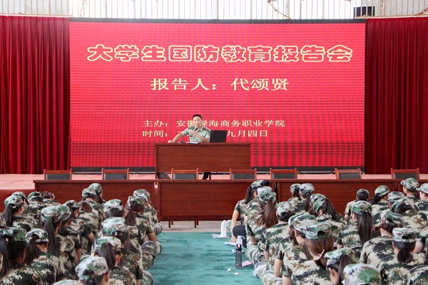 为贯彻落实党的十九大关于加强全民国防教育的部署要求,进一步提高大学生国防意识和安全观念,近日,学院武装部邀请肥西县武装部政工科科长代颂贤少校作大学生国防教育专题报告,2018级全体军训新生及教官、退伍大学生聆听了报告会。